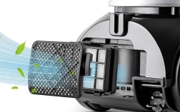 Мощният мотор с мощност 600 W и смукателна мощност 130 W се справя с прах, трохи, косми и замърсявания, заседнали в килимите. Усъвършенстваният HEPA 12 филтър улавя дори много фини частици, така че въздухът у дома е по-чист и свеж. Прахосмукачката работи тихо (около 68 dB), без да притеснява домакинството или домашните любимци.