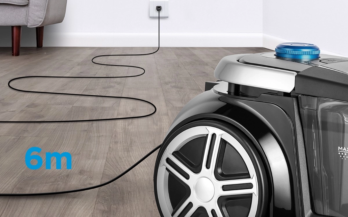 Тесен накрайник, четка за тапицерия и кръгла четка покриват почистването на тесни пролуки, мебели и деликатни повърхности. Телескопичната тръба и маркучът 1,5 m увеличават обхвата.