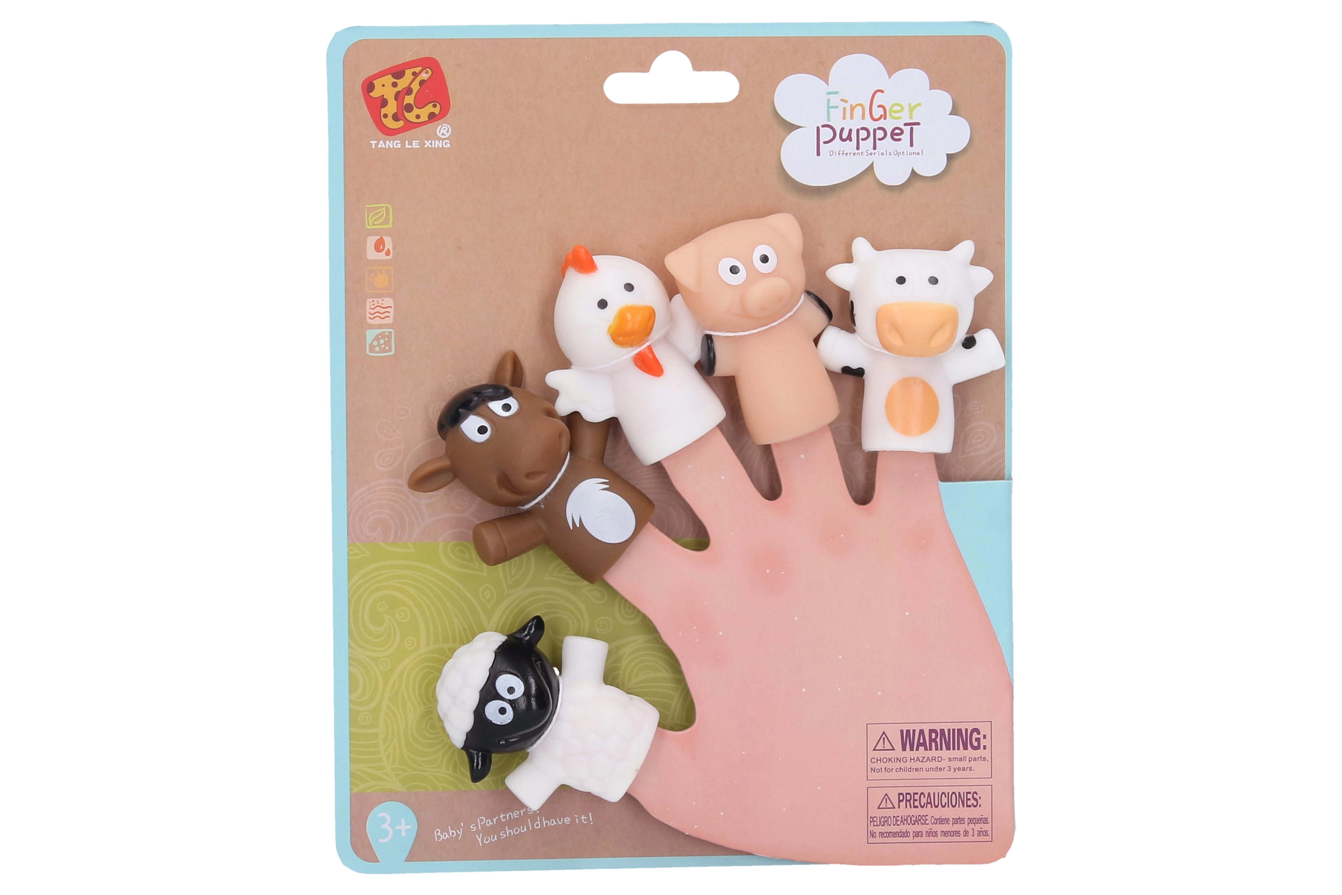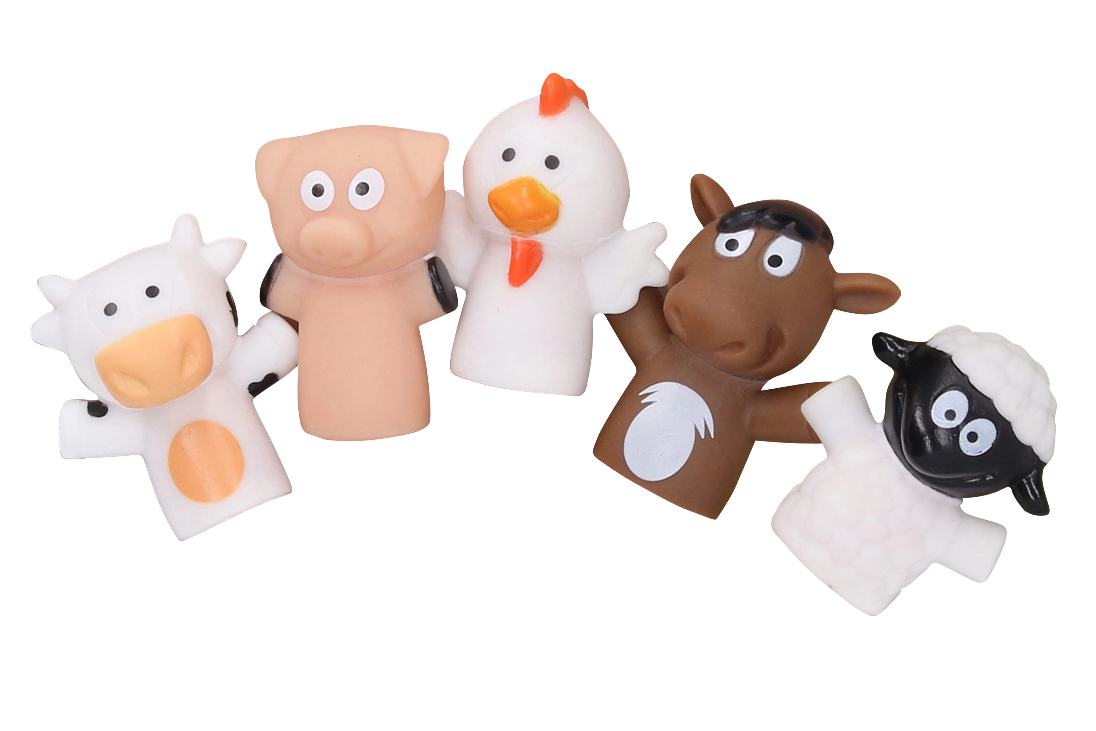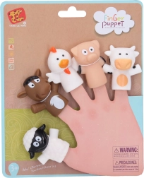 Създайте свое минитеатро със пет сладки животинки за пръст. Пръстовите куклички от мека гума се поставят удобно и помагат на децата да развиват фантазията, разказването и общуването. Прекрасни са за създаване на истории, например в атмосфера на ферма.