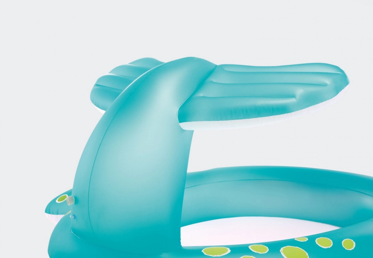 Надуваемият басейн във форма на кит от марката INTEX е идеален избор за летни забавления в двора. Благодарение на интегрираната пръскалка в опашката, която свързвате към стандартен градински маркуч, се създава приятна водна струя, която едновременно охлажда и забавлява. Практичният източващ вентил улеснява изпразването на водата след къпане.