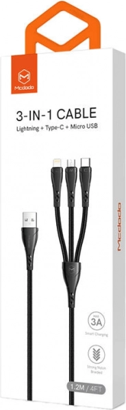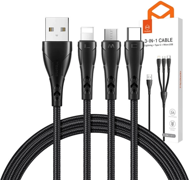 Един кабел, три конектора – с USB‑C, Lightning и Micro USB ще покриете повечето съвременни устройства: смартфони, таблети, безжични слушалки и външни батерии. Кабелът може да захранва до три устройства едновременно, като спестява място и време.