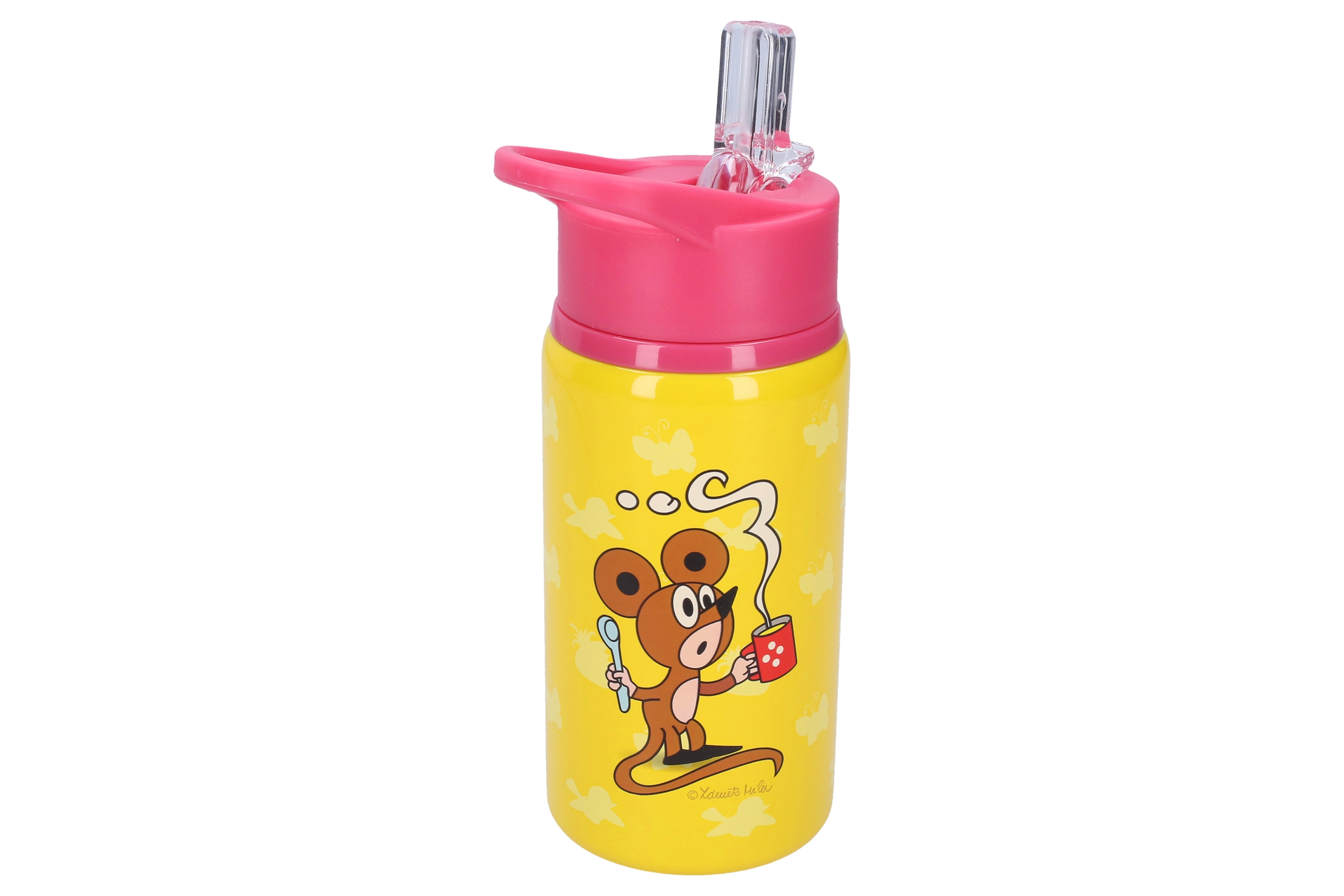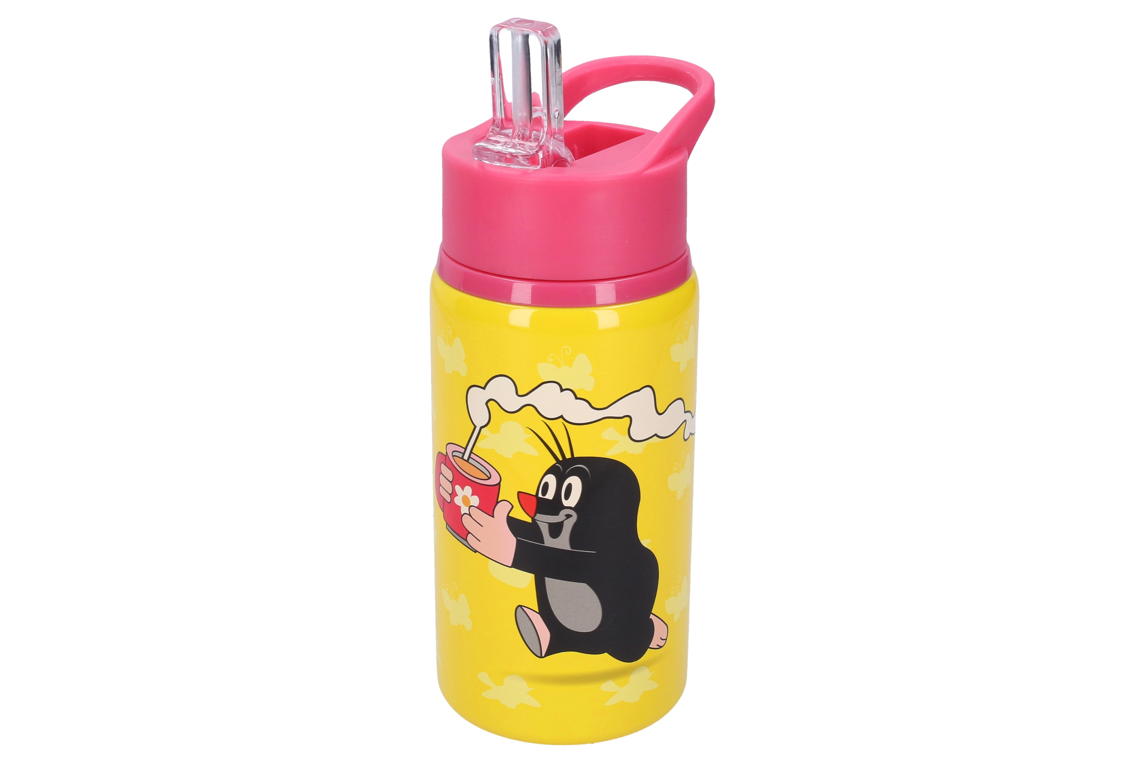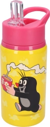 Стилна детска бутилка с мотив на Къртек от издръжлива неръждаема стомана с обем 500 ml. Приляга отлично в ръката, лека е, има розов капак и е идеална за път, детска градина и игрище.