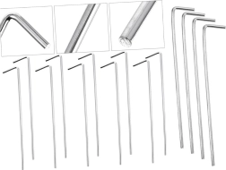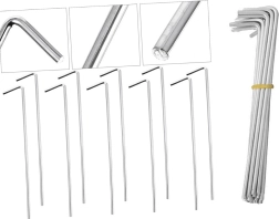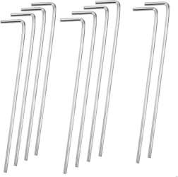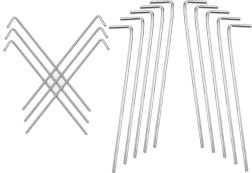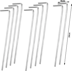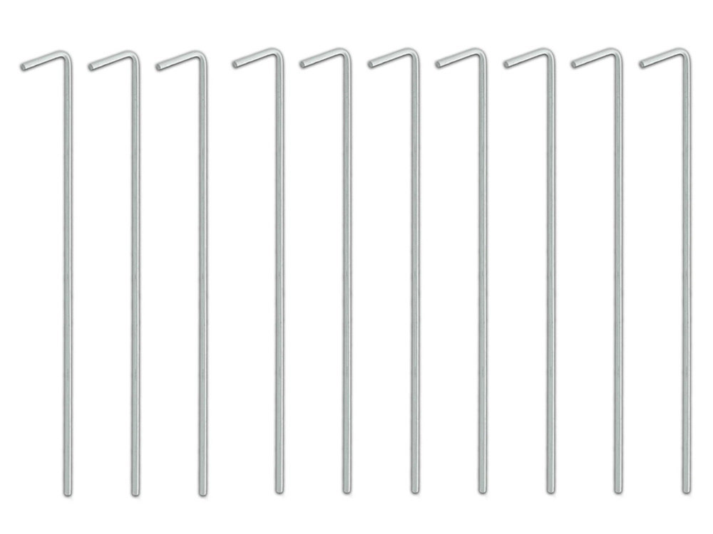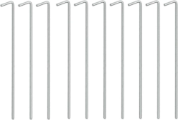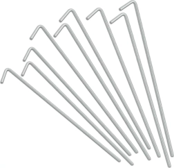 Практичен комплект от 10 стоманени колчета с L завършек, идеален за къмпинг, градина и туризъм. Благодарение на диаметър 4 mm и дължина 24 cm колчетата стоят сигурно в трева, почва и чакъл и предотвратяват разхлабване на въжета или ленти. Опростената форма позволява бързо забиване и изтегляне.