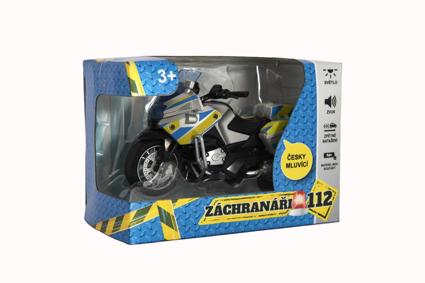 Този реалистичен модел на полицейски мотор е идеален за малки почитатели на пътната служба. Благодарение на комбинацията от метални и пластмасови части играчката е издръжлива и в същото време безопасна за детска игра. След изтегляне моторът потегля сам, а при натискане на задното колело започва да свети, да вие и да говори на чешки – забавлението е гарантирано.