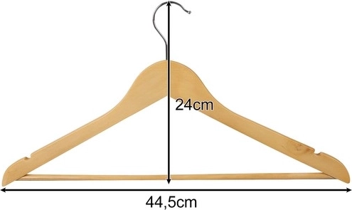Комплектът от 10 дървени закачалки съчетава непреходна визия и висока издръжливост. Закачалките са изработени от масивно дърво и защитени с безцветен лак, който подчертава естествената шарка, като едновременно предпазва от влага и дребни надрасквания. Те придават на гардероба ви чистота, ред и елегантен вид.
