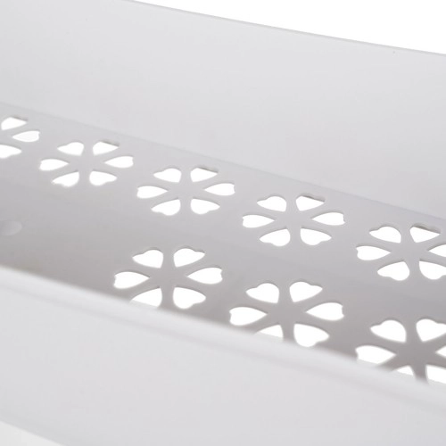 Комбинацията от плътно прилягащи съединения от неръждаема стомана и качествен PP осигурява стабилност и дълъг живот. Перфорираните дъна на рафтовете с флорален мотив не само украсяват интериора, но и подобряват отвеждането на влагата. Четирите въртящи се колелца позволяват плавно придвижване дори в тесни пространства, а практичните куки отстрани държат кърпи, гъби или четки под ръка.