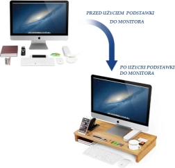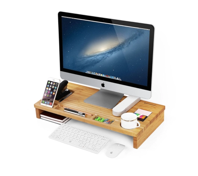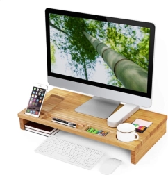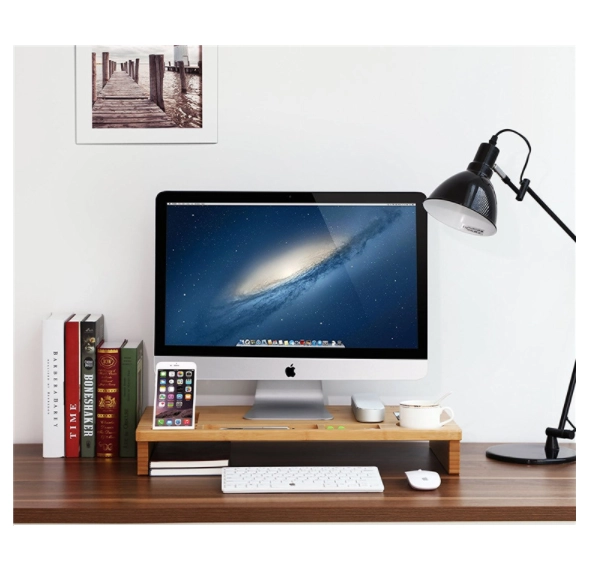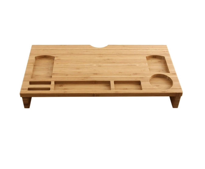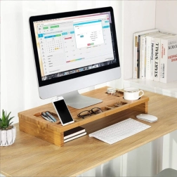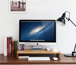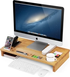 Подобрете работното си място със стилна бамбукова поставка, която комбинира ергономия и организация. Повдигайки монитора до нивото на очите, тя намалява натоварването на врата и гърба, а обмислените отделения държат всички необходими вещи под ръка – от телефон и писалки до чаша.