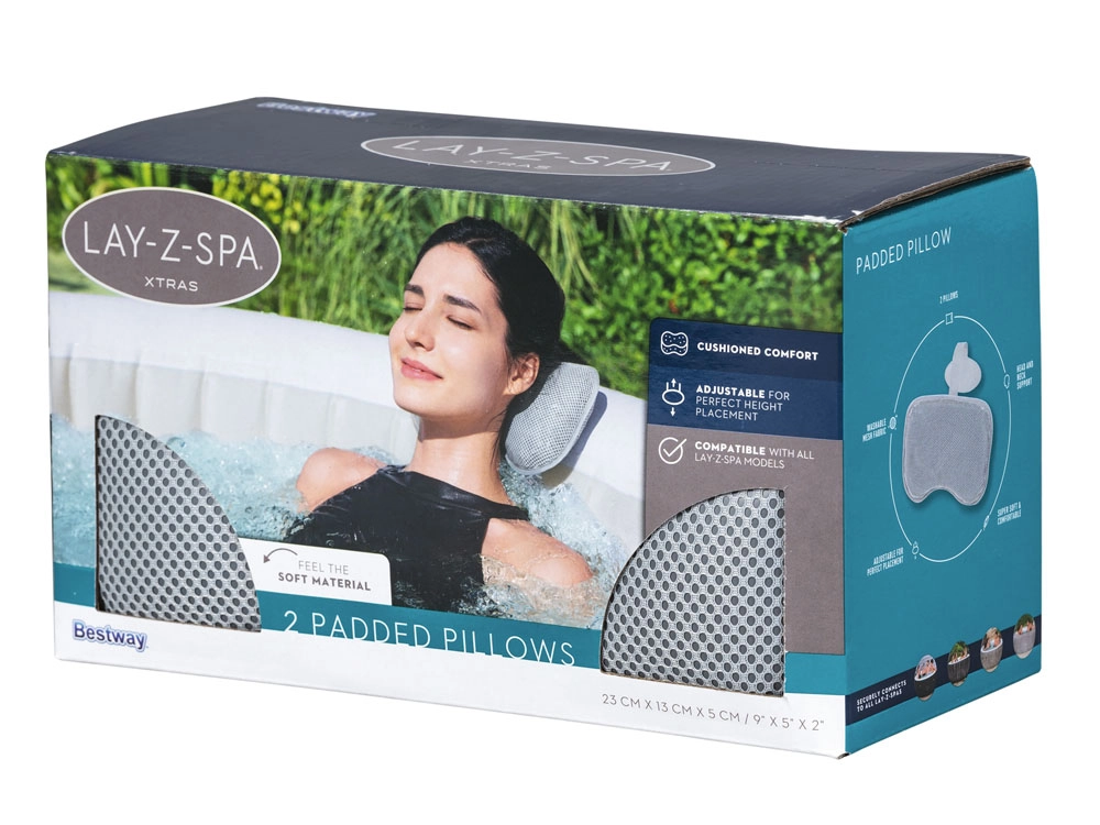 Насладете се на още по‑удобна релаксация в джакузито си с комплекта от две възглавнички LAY‑Z‑SPA. Ергономичните опори от мека пяна с дишащ мрежест калъф осигуряват стабилна опора за глава и врат, а регулируемият ремък с противотежест ги задържа надеждно на място по ръба на джакузито. Универсалният дизайн е съвместим с всички джакузита LAY‑Z‑SPA, а калъфът се почиства лесно.