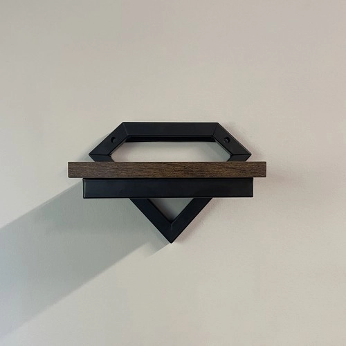 Подчертайте интериора си с модерна стенна етажерка в индустриален стил. Геометричната рамка във форма на диамант от черна стомана създава ефектен контраст с плоскостта от MDF с дървен фурнир. Етажерката е подходяща за дневна, спалня, антре и офис – за растения, свещи, декорации или дребни вещи.