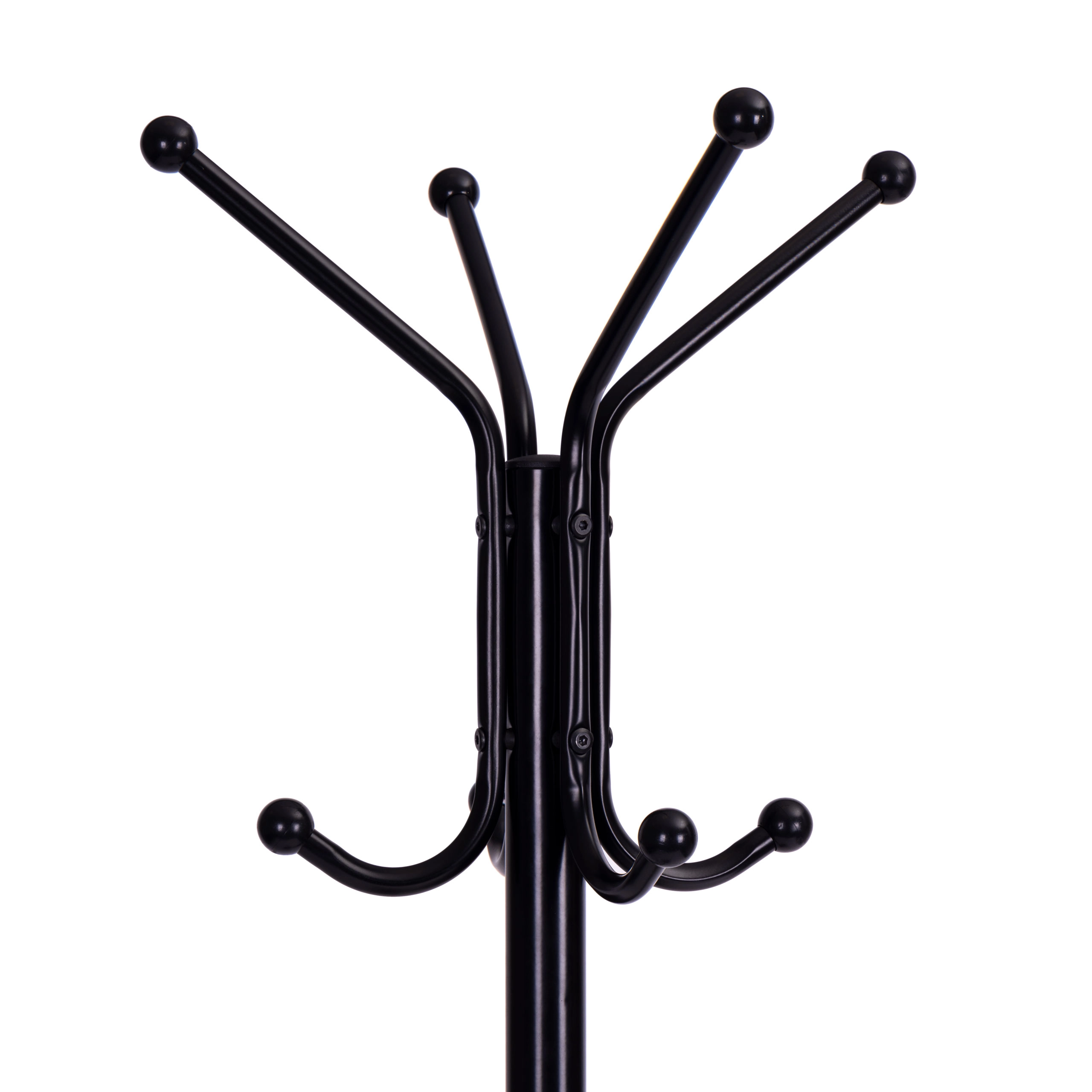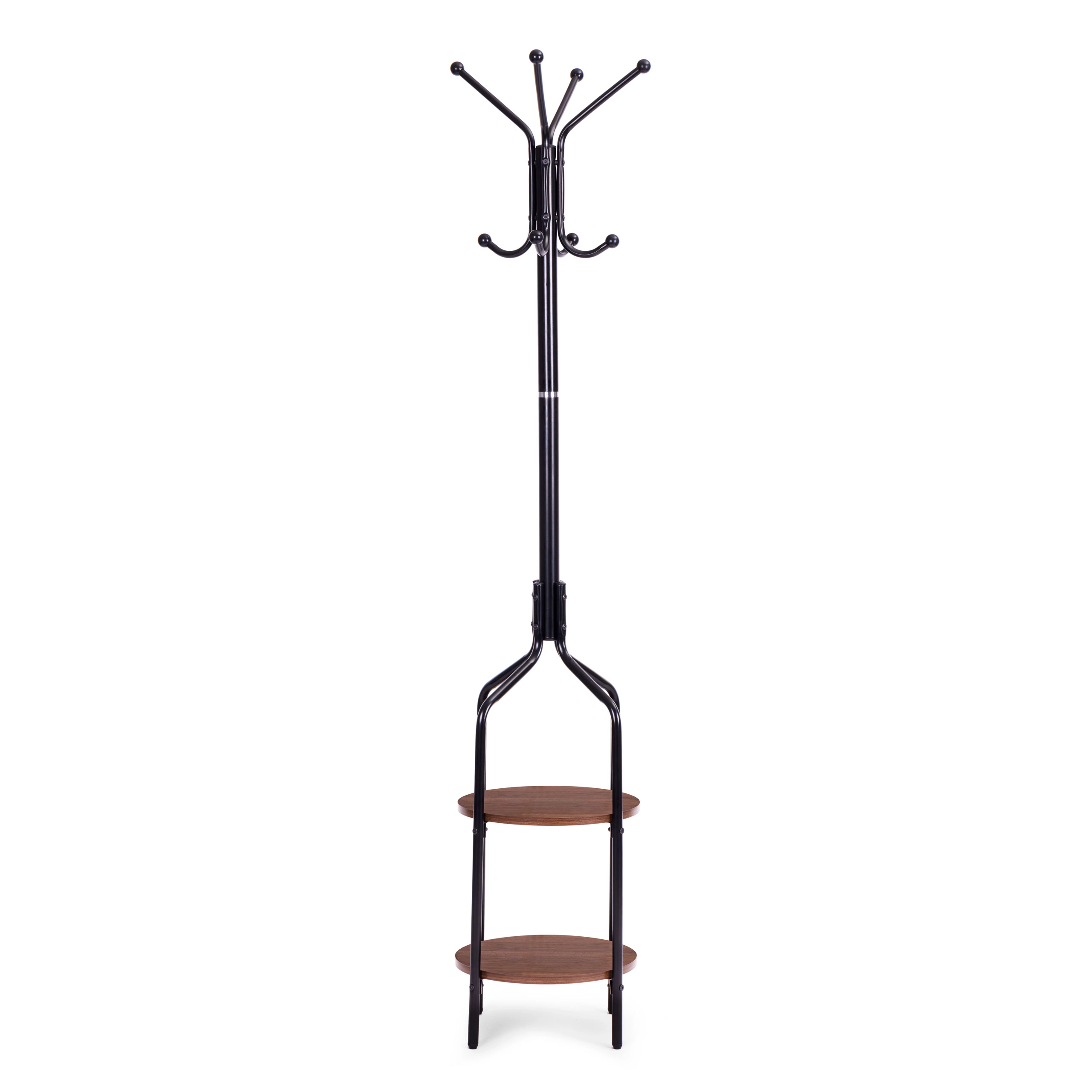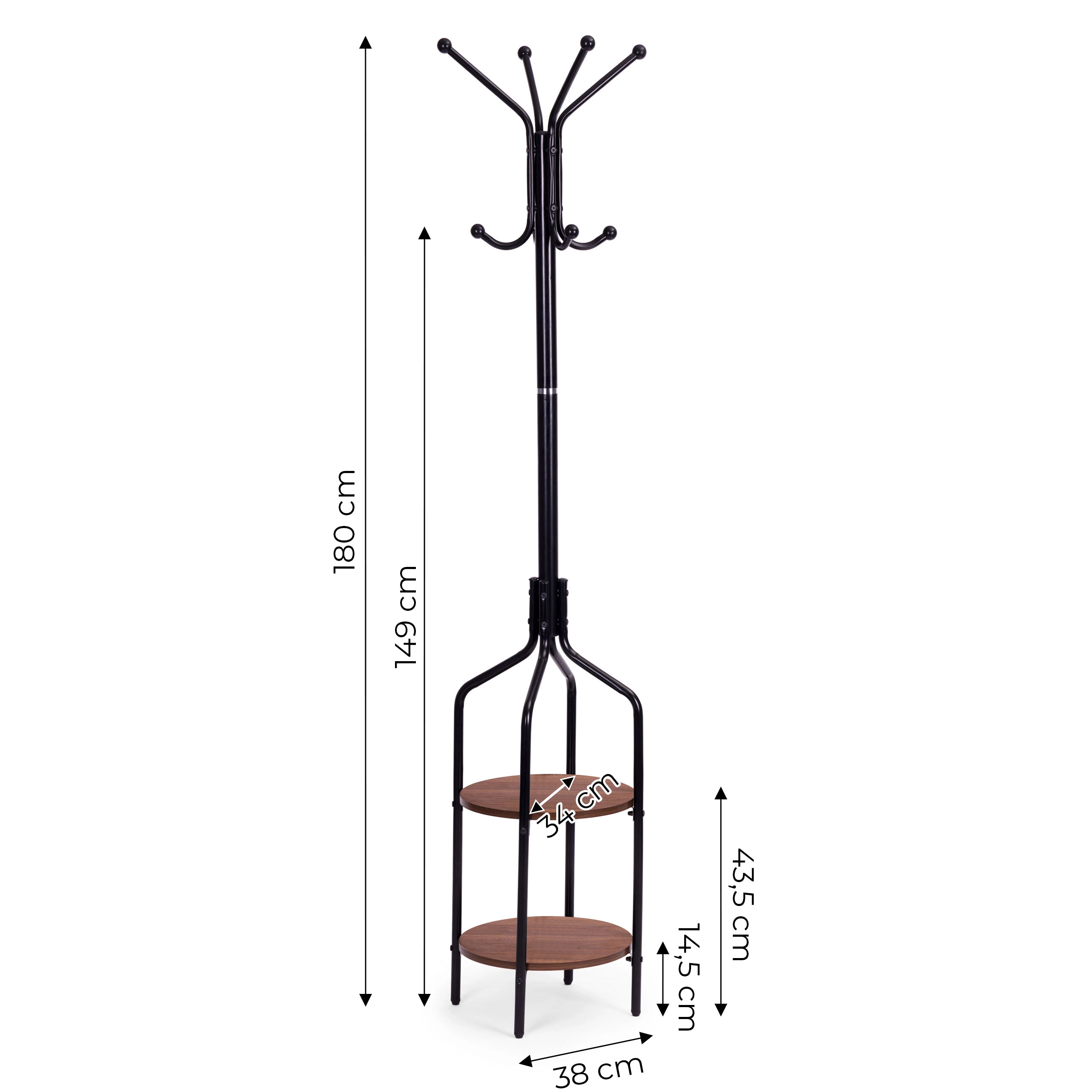 Горната част съдържа четири рамена, които предоставят 8 места за закачане на дрехи. Долната част е оборудвана с два функционални рафта в рустикално кафяво изпълнение. Конструкцията е изработена от прахово боядисан метал, а основата от 4 разширени крачета, които осигуряват стабилност дори при голямо натоварване. Всяко краче завършва с подложка, която предпазва пода ви от надраскване.
