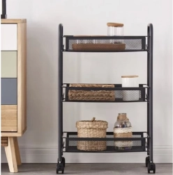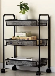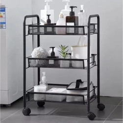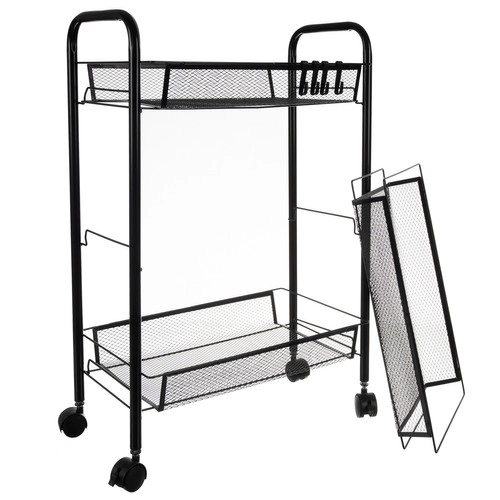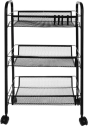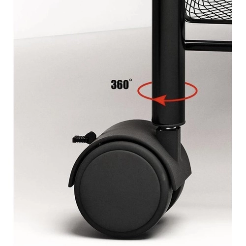 Поддържайте реда стилно. Този компактен, но стабилен рафт от прахово боядисано желязо е създаден за ежедневна употреба. Отворените кош-рафтове осигуряват видимост и циркулация на въздуха, което го прави идеален за храни, козметика и почистващи препарати. Четири висококачествени колела позволяват плавно преместване, като две от тях имат интегрирана спирачка за безопасно фиксиране на място.