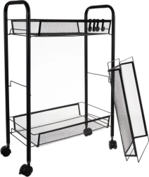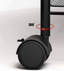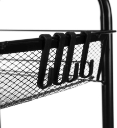 Четири колела за лесно преместване, две от които със спирачка за стабилно фиксиране. Страничните куки осигуряват допълнително място за кърпи, инструменти и дребни вещи.