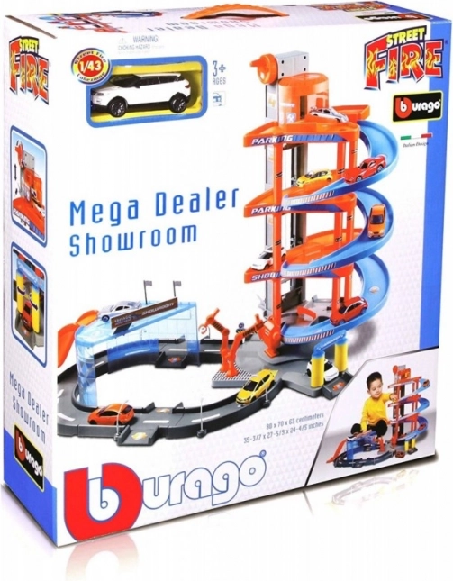 Този цветен гараж Bburago STREET FIRE Mega Dealer showroom е идеален за креативна детска игра. Децата издигат количката с асансьора до най-горния етаж и се спускат по спиралите, спират в сервиза, минават през автомивката и паркират на обозначените места. Благодарение на лесно сглобяемите пластмасови части сглобяването и прибирането е детска игра.