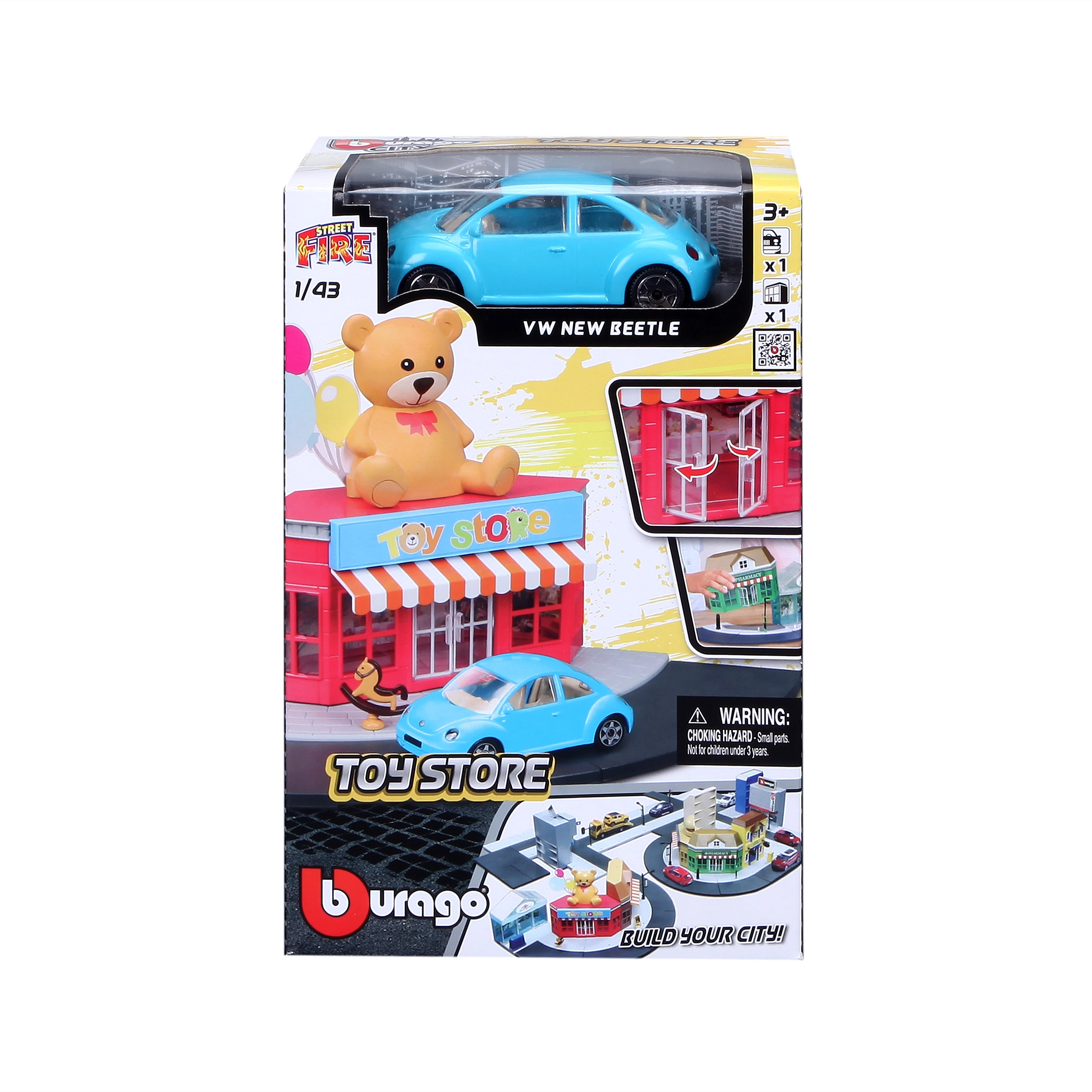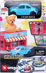 Постройте свое собствено градче с игровия комплект Bburago City Играчница 1:43. Метален модел на автомобил в мащаб 1:43, пластмасова сграда с подвижни врати, улични и тротоарни елементи и различни аксесоари за креативна игра. Комплектът може да се комбинира с други сетове от серията StreetFire.