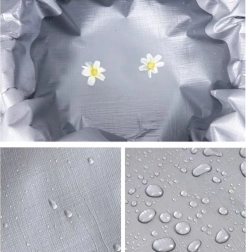 LDPE покритието осигурява пълна водоустойчивост и защита от дъжд, сняг и влага. Двустранното сребристо‑сиво изпълнение повишава универсалността.