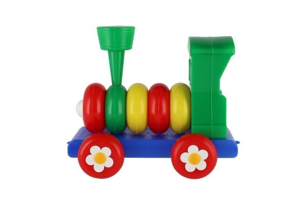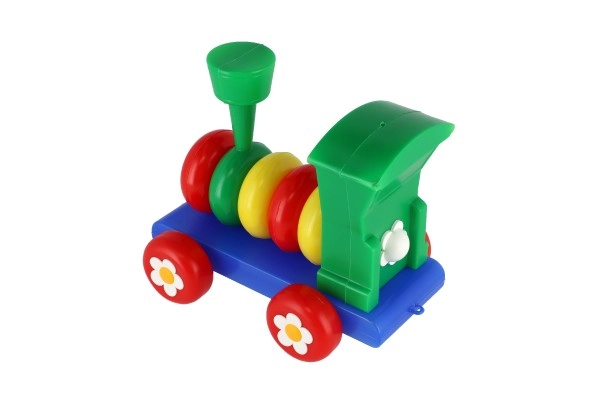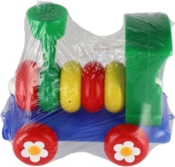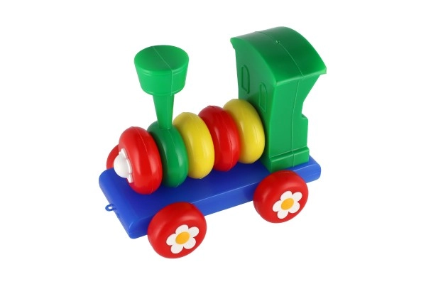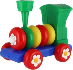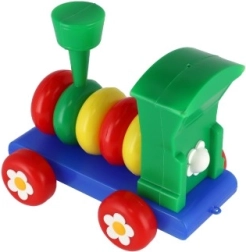 Влакчето е изработено от пластмаса в ярки цветове, които привличат вниманието на децата, и е украсено с флорални мотиви върху колелата.