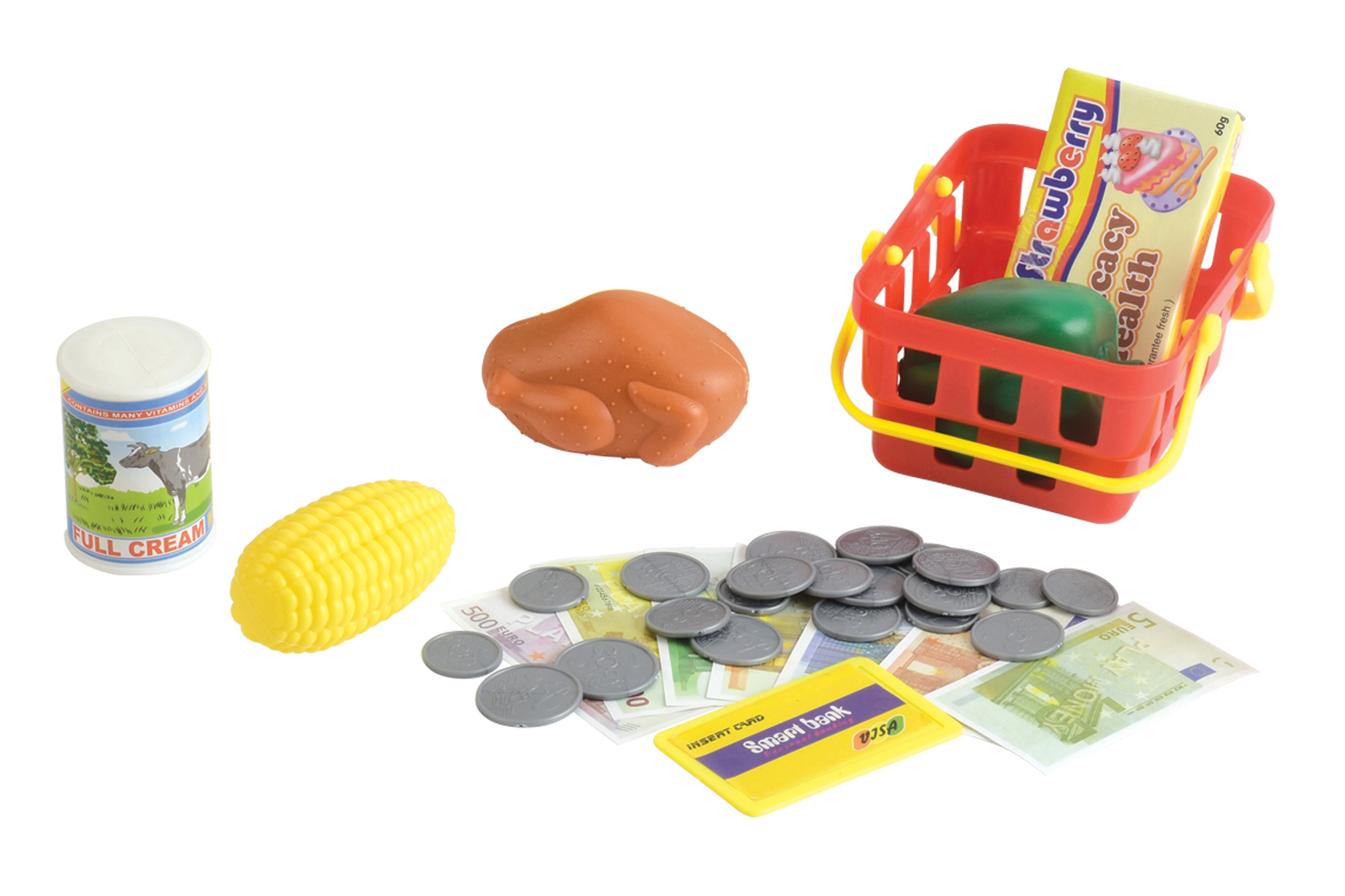 Комплектът съдържа всичко необходимо за обслужване на въображаем магазин, включително кошница с аксесоари, играчни пари и платежна карта. Децата могат да упражняват практическо смятане директно на касата, което подпомага техните математически умения и креативност.