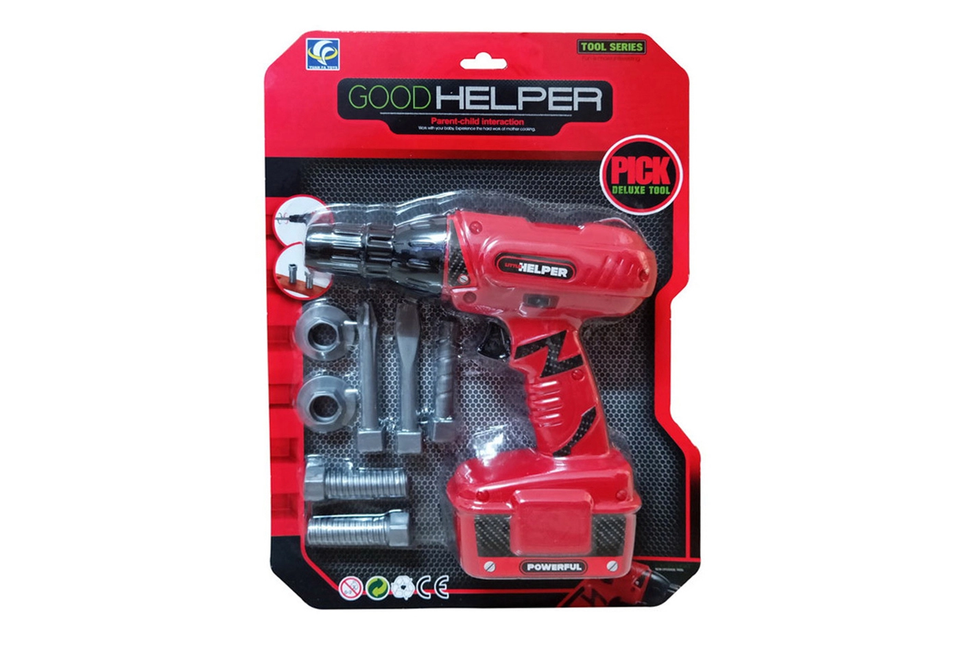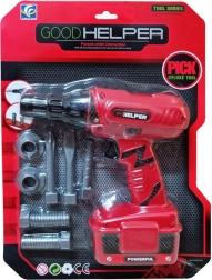 Този комплект съдържа реалистичен акумулаторен винтоверт, който не само изглежда като истински, но и при натискане на бутона се върти и издава автентични звуци на пробиване. Включва сменяеми свредла и винтове, което прави играта още по-реалистична.