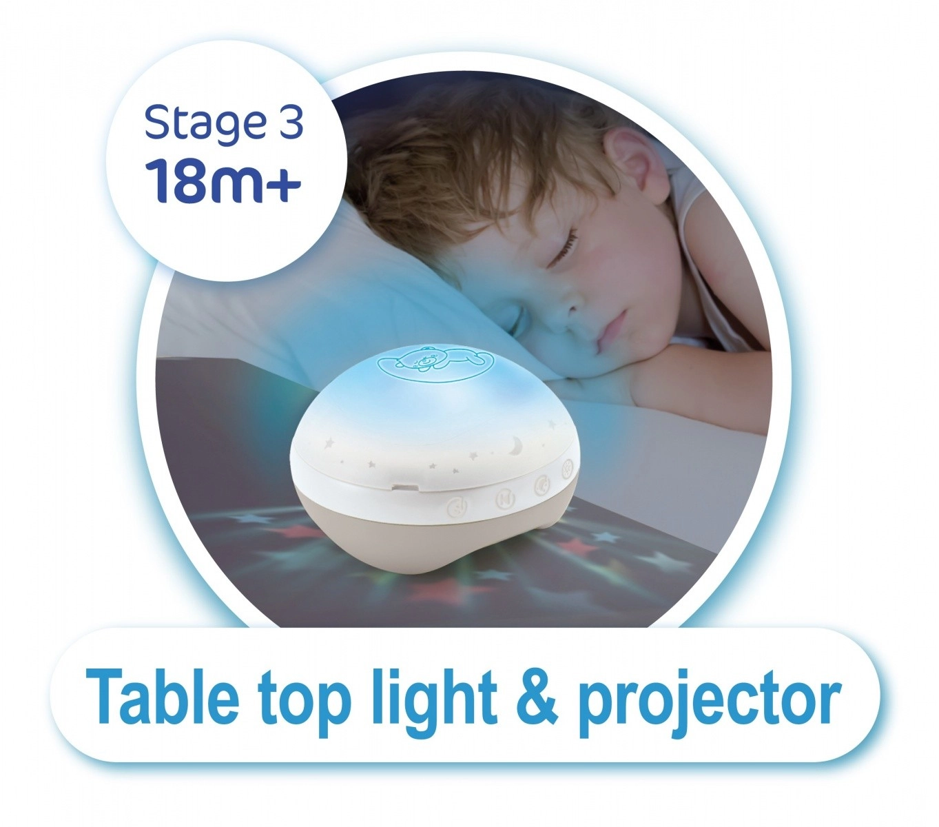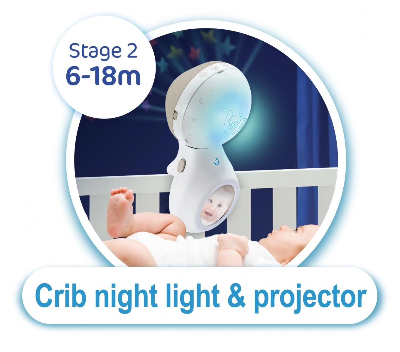 Лесно се закрепва към кошарата и благодарение на трите режима на използване расте с детето: от въртележка (0–5 месеца), през лампа за кошара (6–18 месеца) до самостоятелен нощен проектор за бюро (от 18 месеца).