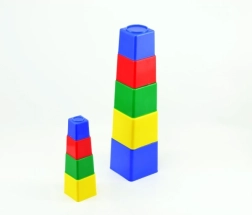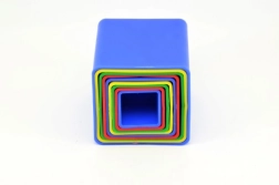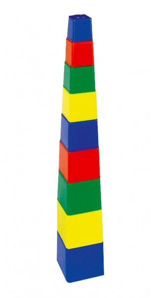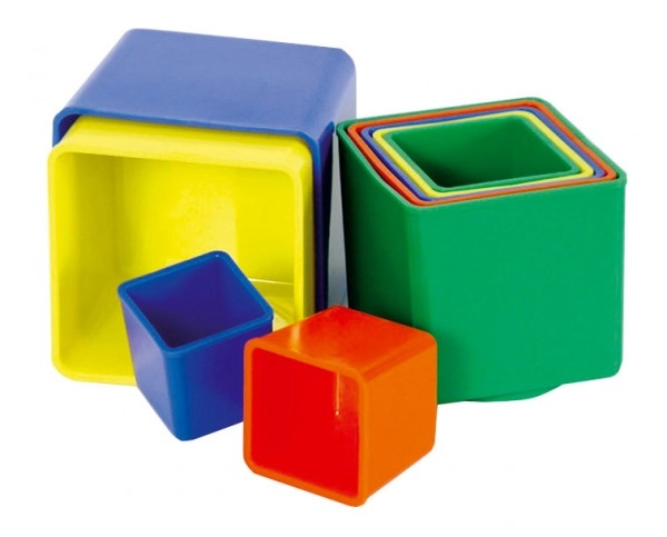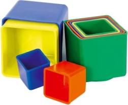 Девет цветни пластмасови кубчета за най-малките подпомагат развитието на фината моторика, логическото мислене и координацията око–ръка. Кухите кубчета могат да се подреждат на кула и да се вкарват едно в друго, като най-голямото е с размер 9 × 9 × 9 см. Подходящи от 1 година, произведени в ЧР. Цветовото изпълнение е в микс от цветове според наличностите на склад.