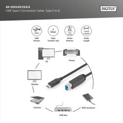 Този висококачествен кабел USB 3.0 с конектори USB‑C (мъжки) – USB‑B (мъжки) е предназначен за свързване на хост устройства (компютър, лаптоп, USB хъб) с периферии, оборудвани с порт USB‑B, като външни кутии за твърди дискове, скенери или принтери. Благодарение на стандарта USB 3.0 постига SuperSpeed трансфер до 5 Gbit/s, което е до 10× по‑бързо от USB 2.0, позволявайки бързи архиви и плавна работа с големи файлове.
