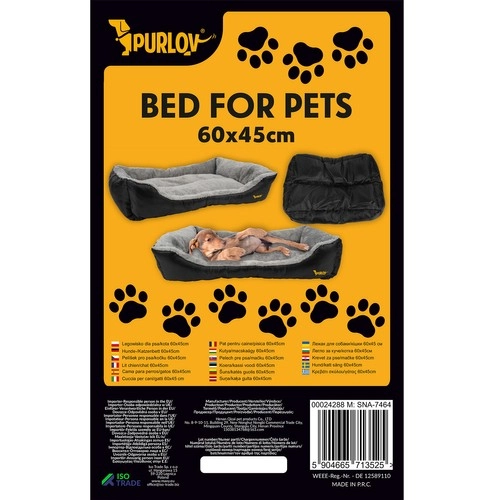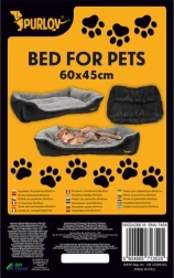 Леглото Purlov с размер 60 × 45 cm (външни 65 × 50 × 13 cm) е проектирано за удобен сън на по-малки и средни породи. Меката сива вътрешност и издръжливите черни бордове осигуряват комфорт, опора и дълъг живот. Благодарение на ниския вход в леглото лесно се качват и кученца, и по-възрастни животни.