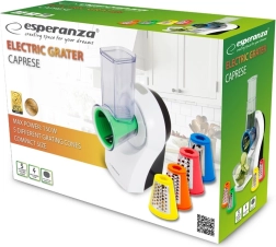 Електрически резач Esperanza е идеален за смилане на плодове, зеленчуци, твърдо сирене, шоколад, ядки и приготвяне на трохи. С петте си сменяеми накрайника можете да регулирате формата и дебелината на нарязаните продукти според нуждите на конкретното ястие.
