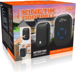Без повече кабели и смяна на батерии. Кинетичният звънец MT5701 използва енергията от механичното натискане на бутона, която преобразува в електричество, необходимо за изпращане на сигнал към звънеца в контакта. Инсталацията е бърза и чиста – бутонът се поставя до вратата или портата, а приемникът се включва в електрическия контакт.