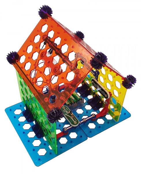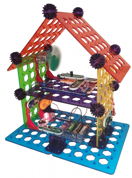 Комплектът BOFFIN II Моят дом е идеален за деца от 8 години, които искат да разберат принципите на електричеството и умния дом. Основата е перфорирана платка, върху която частите се щракват лесно – без запояване, безопасно и с незабавен резултат. Ще построите осветление, аларма, двуетажна къща, вятърна мелница и парти къща и ще проверите функционалността според приложените схеми.