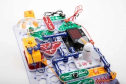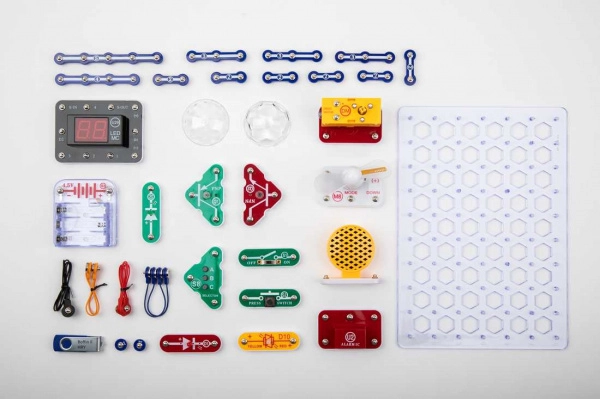 - 1× платка, 35× компонента (напр. самолет, миникола, говорител, датчик за движение, мотор с редуктор), 1× наръчник (за изтегляне онлайн)