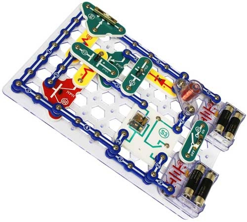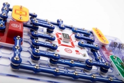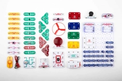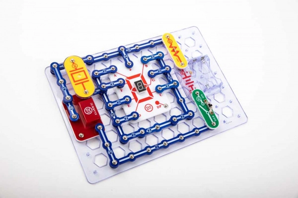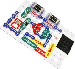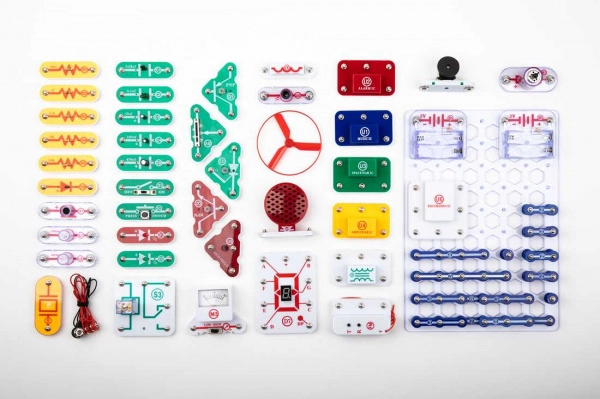 Частите се закрепват към основната платка с помощта на snap контакти. Цветното разграничаване и надписите на компонентите улесняват ориентацията дори за деца от 8 години.