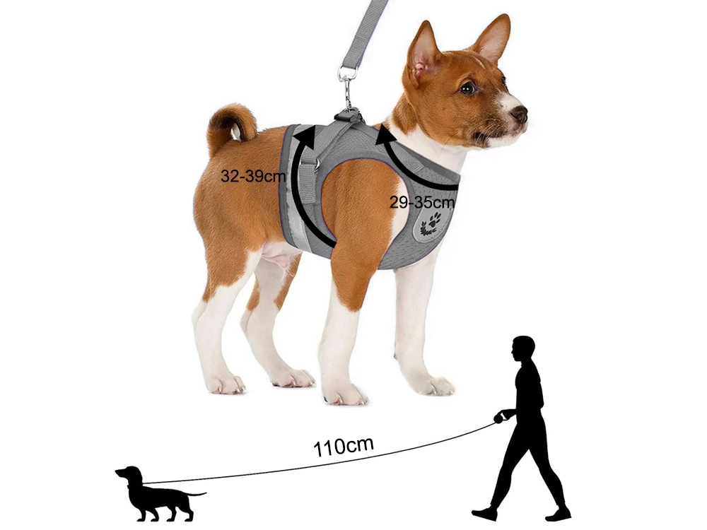 - Размер M – гръдна обиколка 32–39 см, врат 29–35 см, повод 110 см.