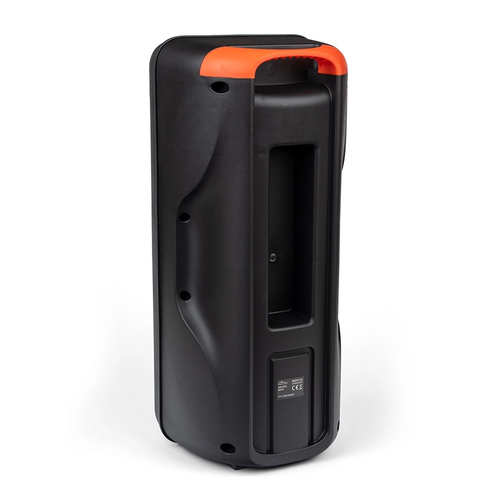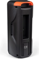 Добре обмислената конструкция включва преден панел с контролни бутони, портове за различни връзки и практична дръжка за лесно пренасяне. В комплектa са включени също заряден кабел и AUX кабел.