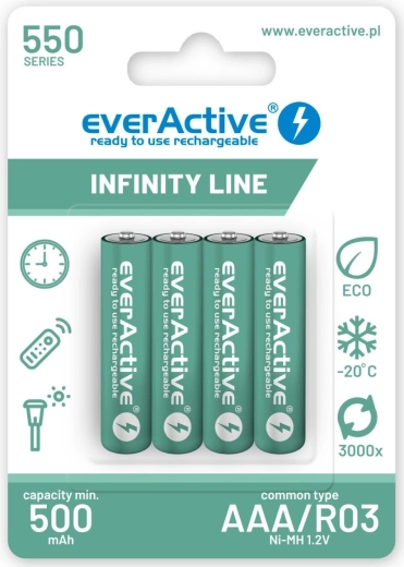 Комплект от 4 акумулатора AAA R03 с капацитет 550 mAh с технология ready to use за незабавна употреба. Серията Infinity Line е идеална за соларни лампи, безжични телефони и други устройства с ниска до средна консумация, където отлично заменят еднократните батерии и осигуряват икономии за бюджета и околната среда.