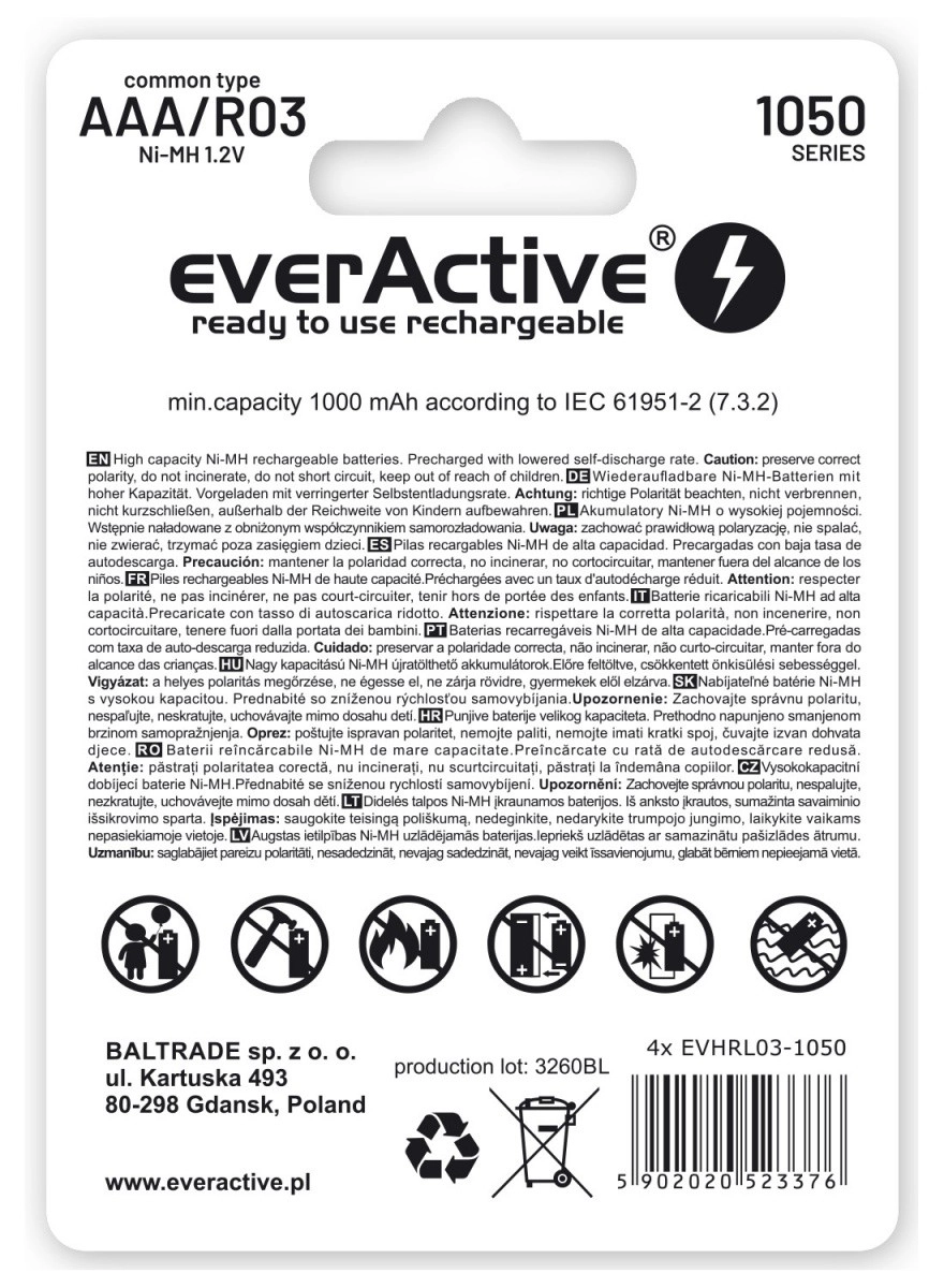 - Съвместимост: пълна замяна на батерии AAA/R03 в устройства, изискващи по-нисък токов товар.