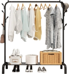 Поддържайте ред у дома с практичната стояща закачалка за дрехи с долна полица за обувки. Здравата стоманена конструкция в черно съчетава издръжливост, стабилност и модерна визия. Благодарение на просторната щанга за закачалки и долната полица лесно създавате прегледна организация в антрето, спалнята или офиса.