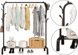 Тази самостоятелна закачалка за рокли и палта предлага щедро място за окачване на облекла и в същото време практична полица за съхранение на обувки, кутии или кошници. Здравата рамка от стоманени тръби с черно покритие осигурява дълъг експлоатационен живот и елегантен минималистичен дизайн, който подхожда на всеки интериор.