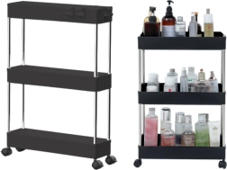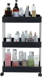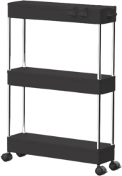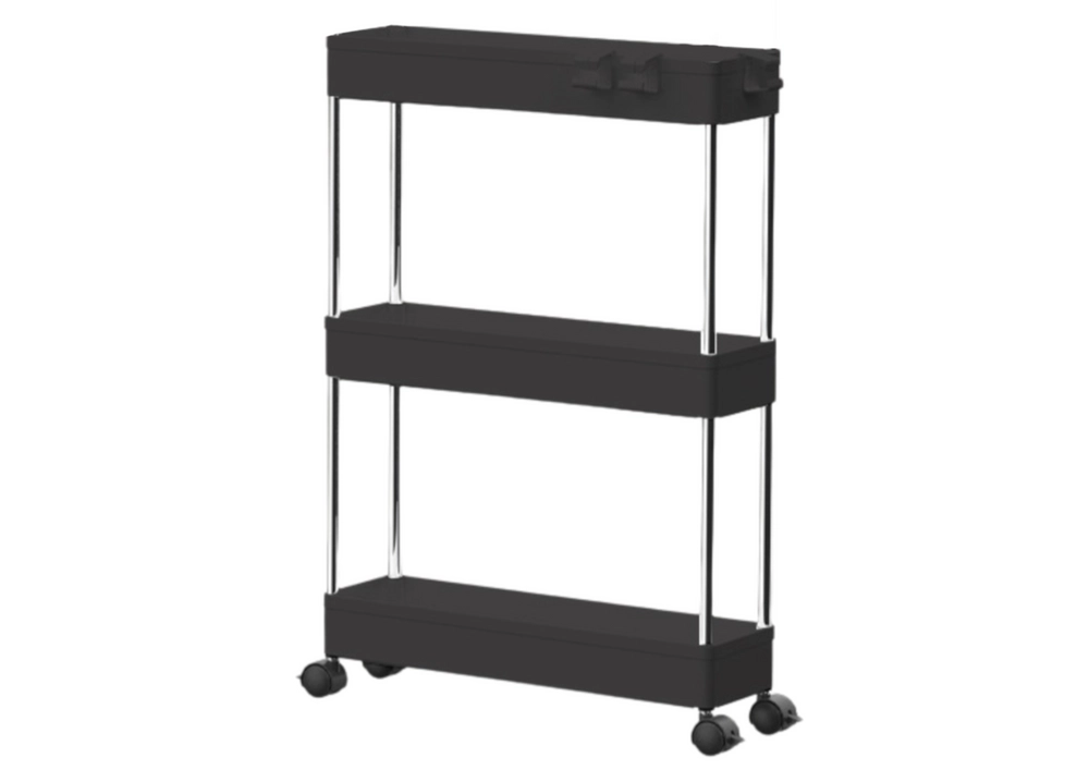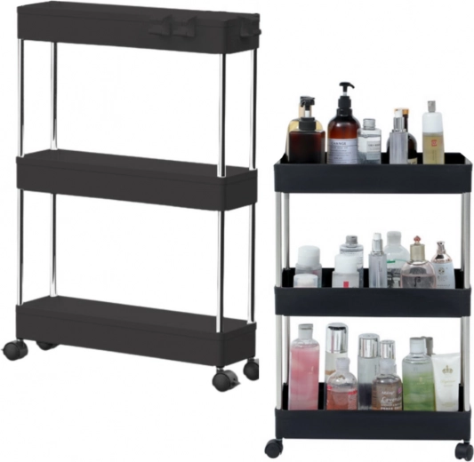 Практичен подвижен рафт с 3 рафта в елегантен черен цвят за лесна организация в кухнята, банята и всекидневната. Благодарение на компактните размери, мобилната конструкция на колелца и стабилната изработка от метал и издръжлива пластмаса, предлага подредено съхранение на подправки, козметика, книги и декорации.
