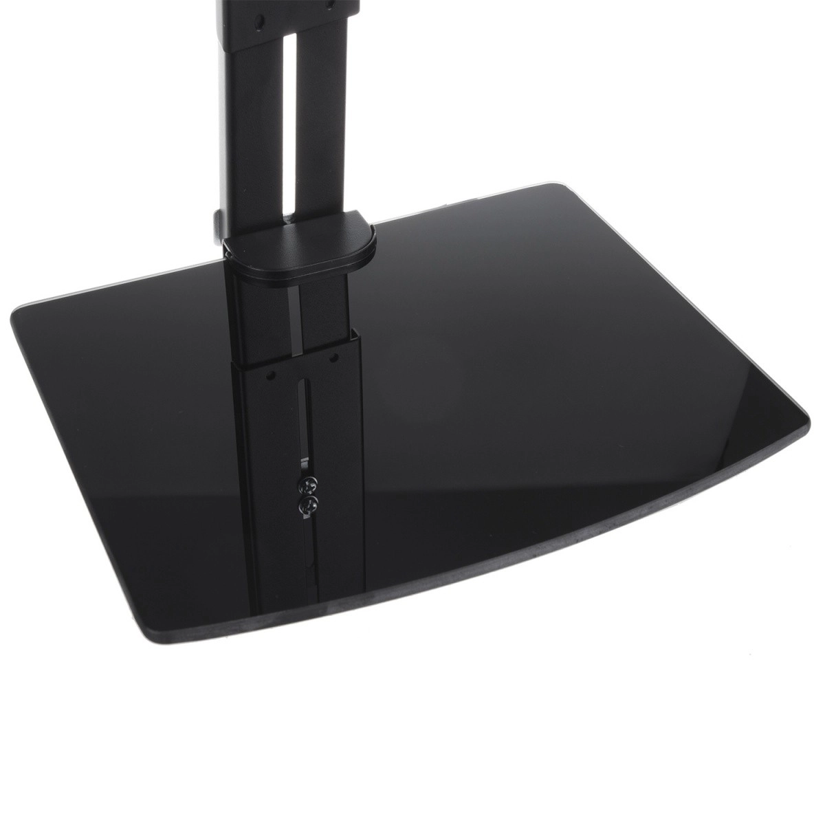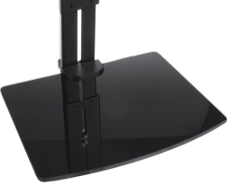 Интегрираният стъклен рафт побира Blu‑ray плейър, сет‑топ бокс, гейминг конзола или таблет и помага да поддържате кабели и аксесоари подредени на едно място.