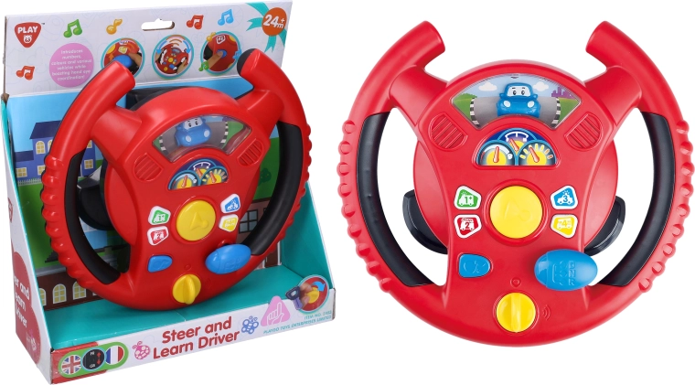 Интерактивният волан Playgo носи на децата забавна игра на шофиране в мини град. Въртящ се превключвател в долната част на волана служи за включване, в центъра ще намерите клаксон, вдясно – скоростен лост за звуци на шофиране, а по венеца на волана – малки бутони с тонове и мелодии. Децата ще се радват на реалистични ефекти, напомнящи истинска кола, докато развиват координацията и въображението си.