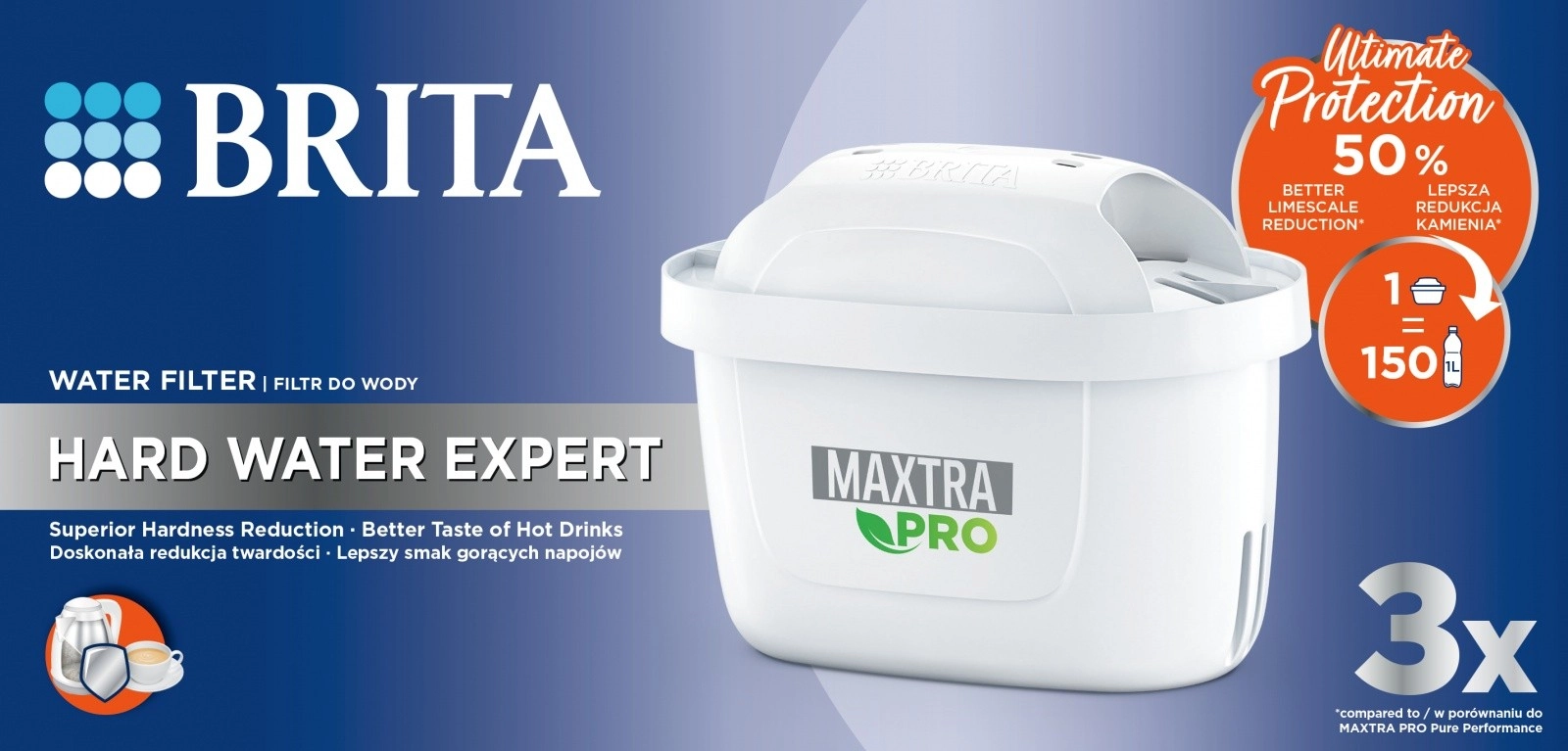 Филтрите BRITA MAXTRA PRO Hard Water Expert са проектирани специално за твърда и много твърда вода. Те подобряват вкуса и аромата на водата, намаляват образуването на котлен камък и помагат да поддържате кани и кафемашини в по-добро състояние. Съвместими са с кани BRITA от сериите Aluna, Marella, Style, Elemaris, Flow, както и със стъклената кана Glass.