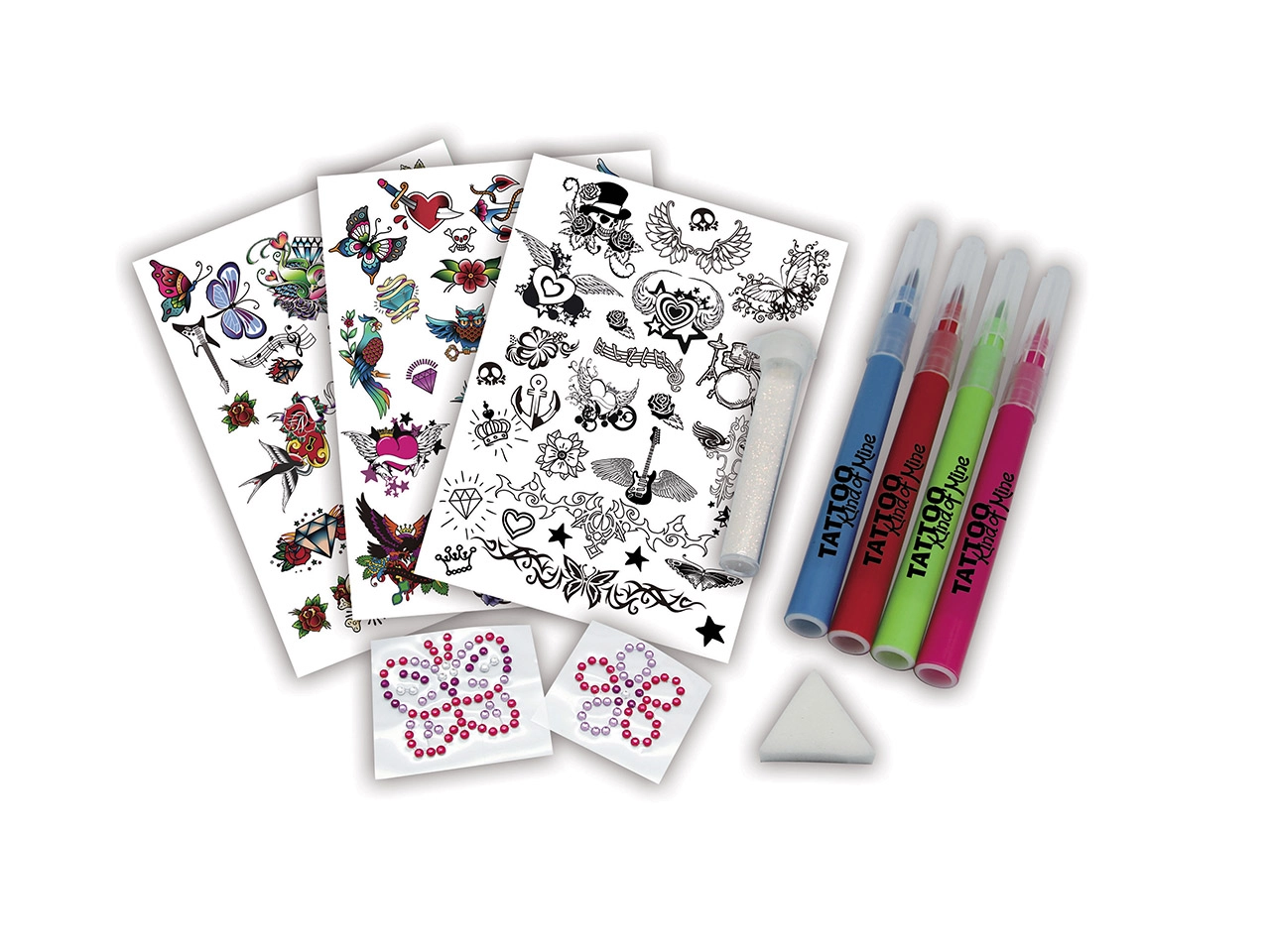 Създайте свои собствени оригинални татуировки или опитайте да пресъздадете любимите си мотиви. Комплектът е лесен за използване и забавен за всякакъв повод.
