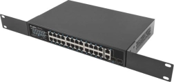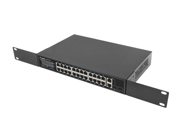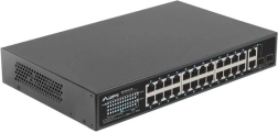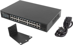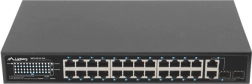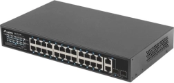 24 PoE+ порта 10/100 Mb/s доставят захранване и данни по един кабел. Реалният бюджет 250 W позволява едновременно да се захранват до 16 устройства 802.3af (15 W/порт) или 8 устройства 802.3at (30 W/порт).