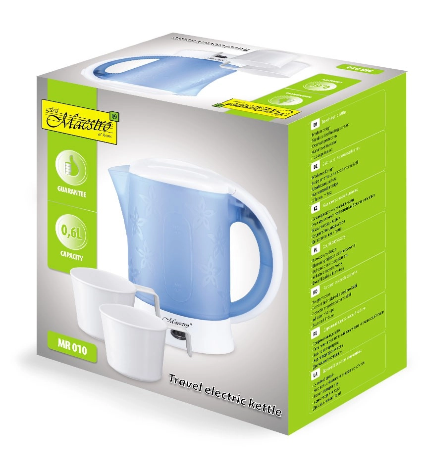 Каната има удобно, ръчно отваряне на капака, а дължината на захранващия кабел е 54 см. Продуктът тежи 560 г, а размерите му са 16,5 x 10,6 x 15,5 см, което го прави практичен и лесен за съхранение. Пътническа електрическа кана Maestro MR-010 е отличен избор за хора, търсещи практично и надеждно оборудване за пътуване.