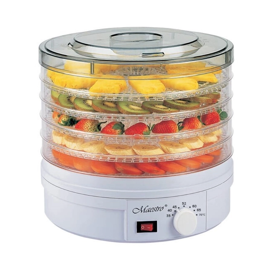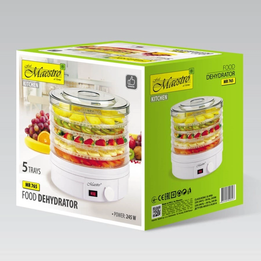 Сушилнята Maestro е оборудвана с 5 тавички с диаметър 32 cm, които позволяват сушене на голямо количество продукти наведнъж.