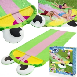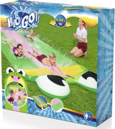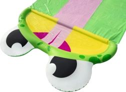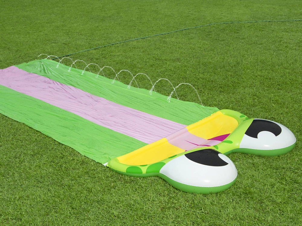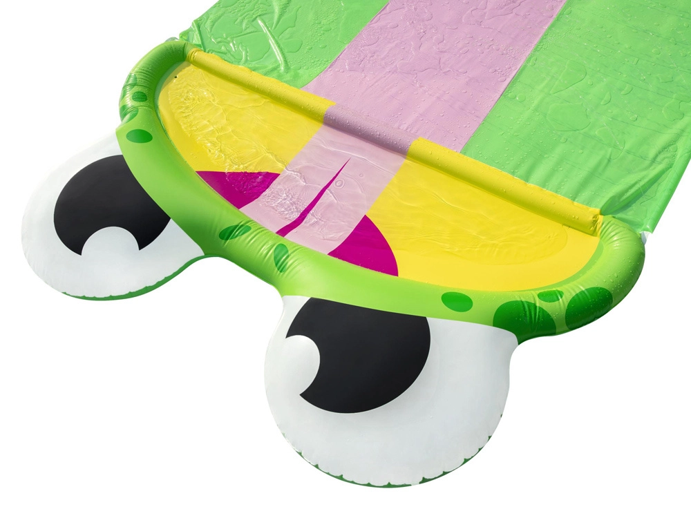 Монтажът е бърз и лесен – просто разгънете пързалката на тревата, свържете градинския маркуч и забавлението може да започне!