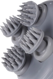 Четири въртящи се масажни глави със силиконови накрайници възпроизвеждат месещите движения на пръстите и отпускат напрежението в скалпа и във врата.