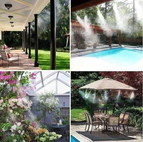 Универсална употреба: край басейн, на тераса, в пергола, на балкон, в градина и оранжерия. Фината мъгла помага да намалява праховите частици, повишава комфорта при престой навън и може да прогонва летящи насекоми. Комплектът е лек и издръжлив, изработен от PVC в практична черно–оранжево–зелена цветова комбинация.