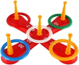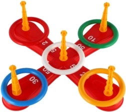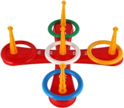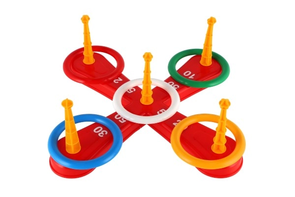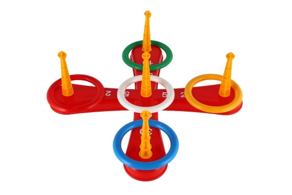 Играта включва кръстообразна основа и цветни рингове за забавно хвърляне.