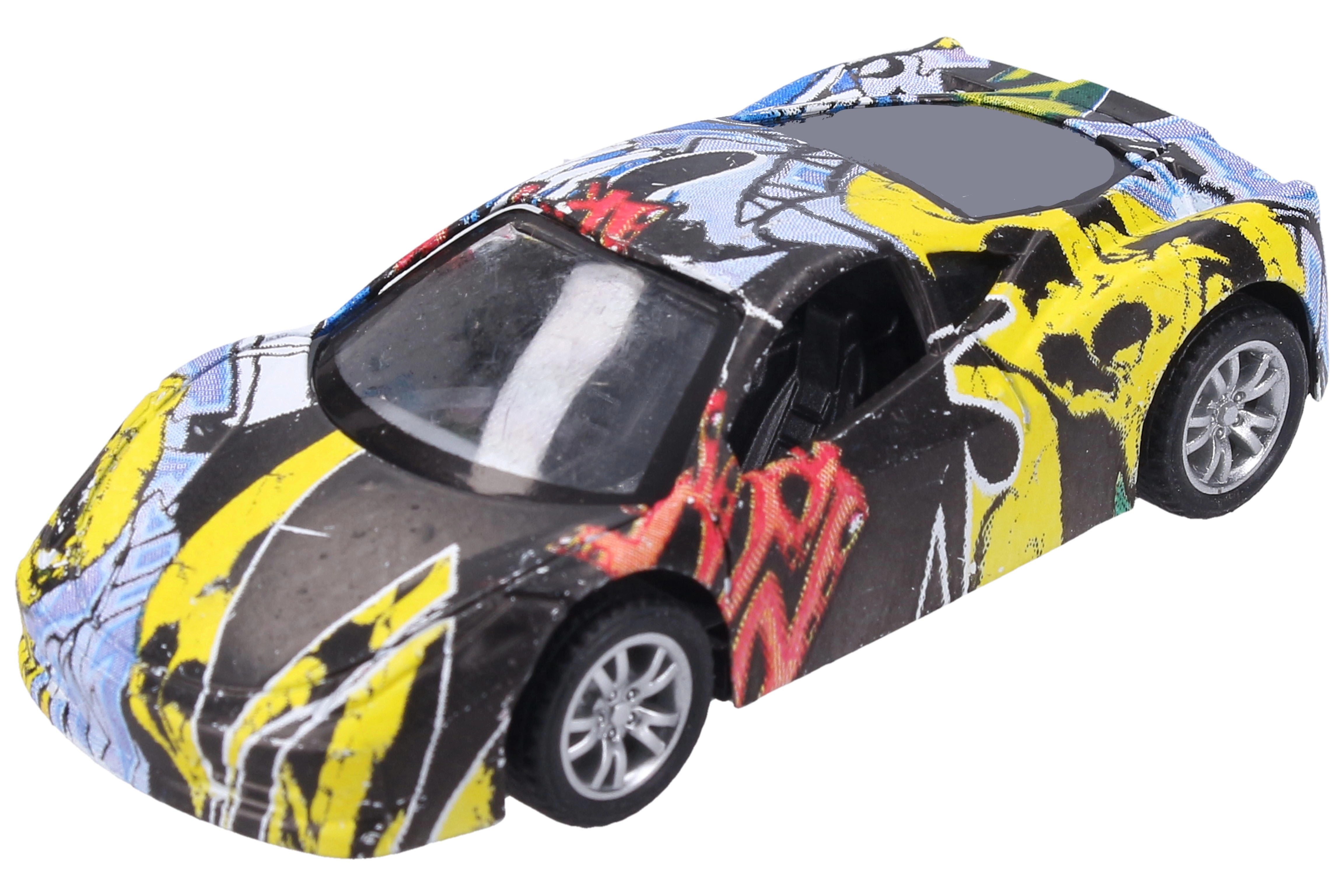 Стилно метално автомобилче с оригинален дизайн с графити, което ще зарадва малки и големи колекционери. Компактният размер 9 см, задният навиващ механизъм и 3 различни варианта го правят отличен избор както за игра, така и за колекция.